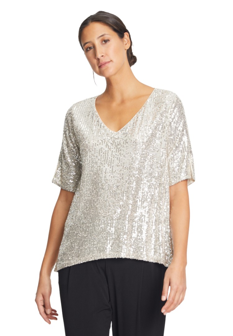 Dieses edle Shirt mit 1/2 Arm sowie V-Ausschnitt wurde allover mit Pailletten versehen und läst sich in cream-silver überaus leicht kombinieren