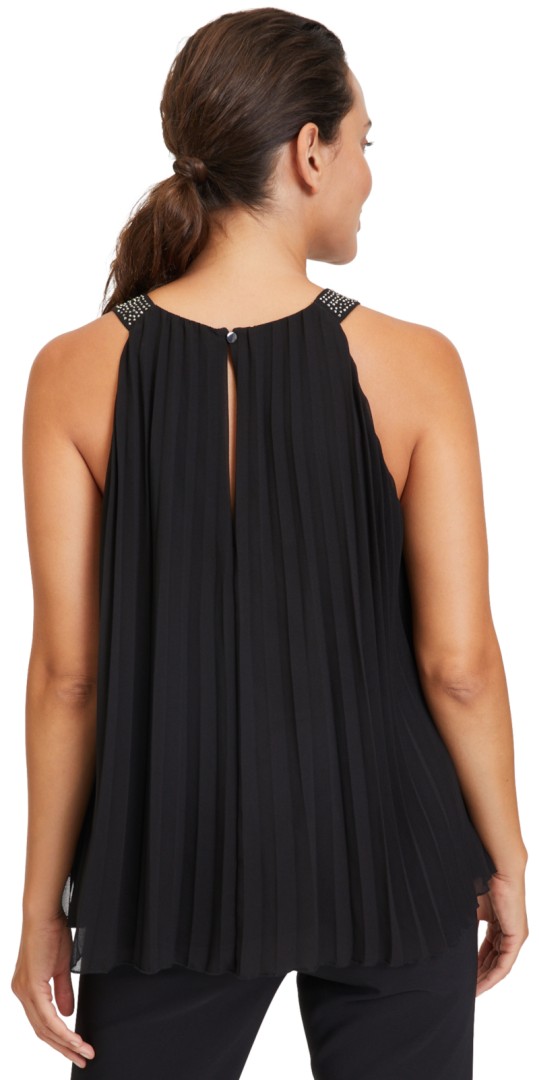 Bei diesem romantischem Plissee Shirt in schwarz mit rundem Ausschnitt wurden die Träger mit edlem Strass besetzt