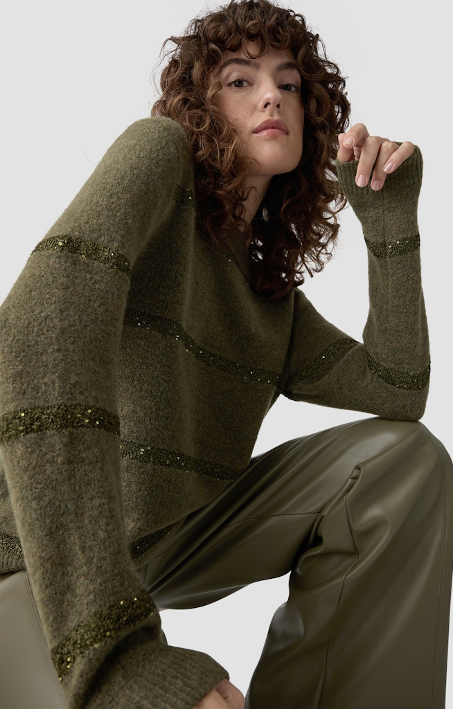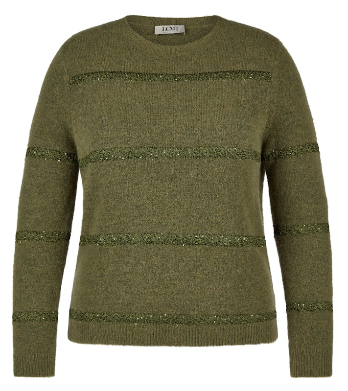 Dieser edle kuschelliege Pullover mit Wolle und Alpaka in Lorbeer wurde mit rundem Ausschnitt designt und ist ein echter Hingucker für die kältere Jahreszeit
