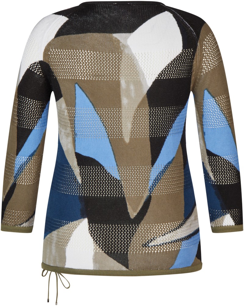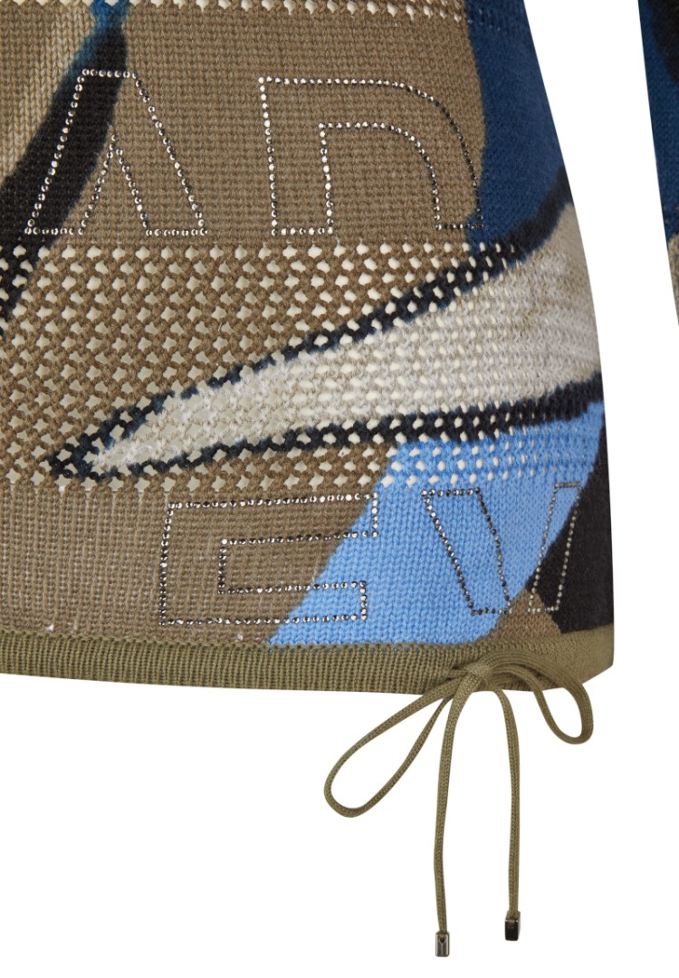 Dieser sportiv-romantische Pullover in mehrfarbig mit grün gemustert ist einfach nur top! Die vielen Details wie der 3/4 Arm sowie der dezente Glanz und das Bändchen zum raffen machen diesen Pullover zum Hingucker