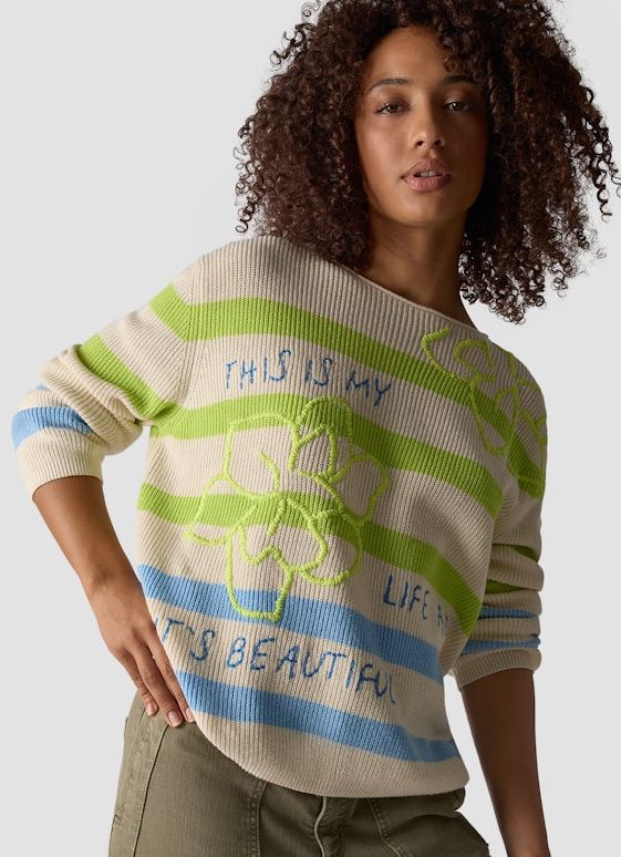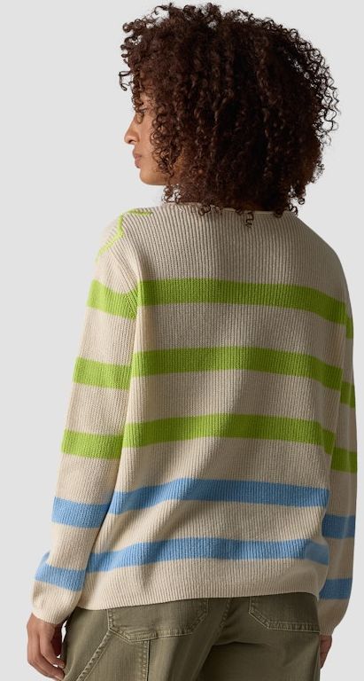 Dieser sportive Pullover wurde in mehrfarbig Bleu-Grün-Elfenbein mit 1/1 Arm und rundem Ausschnitt gefertigt. Auch das dezente Stiching macht diesen Pulli mit rundem Ausschnitt zum Must-have