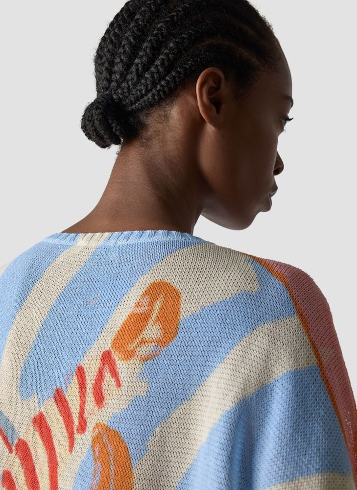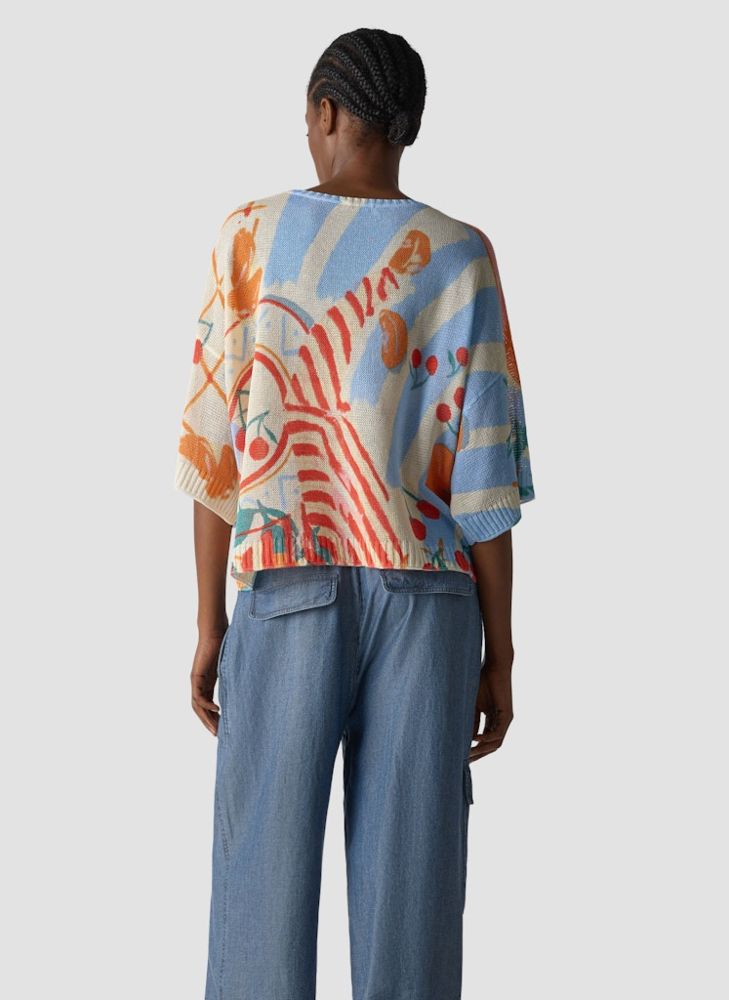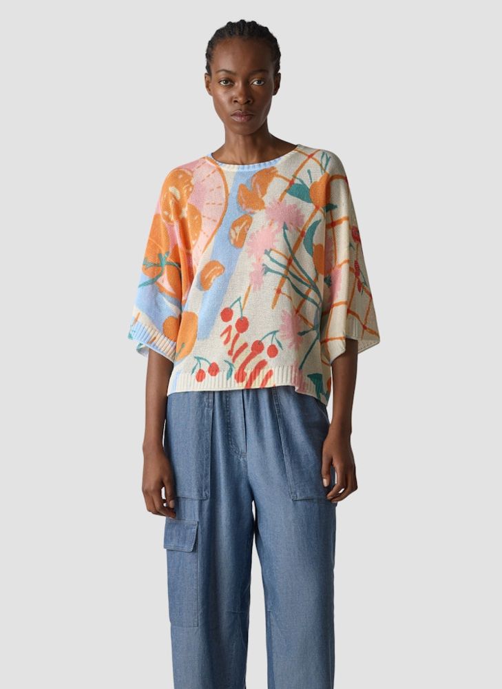 Dieser Pulli wurde mit rundem Ausschnitt und 3/4 langem Fledermaus Arm designt. Allover mit sommerlichen Motiven versehen ist der Pullover ein echtes Highlight
