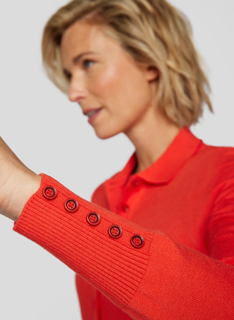 Weiches hautfreundliches Garn aus der Serie EINZIGARTIG sorgt bei diesem Pullover mit Kragen in Safran für ein tolles Hautgefühl. Dieser zeitlos sportive Pullover mit den sportiven Knöpfen an den Ärmeln wird auch höchsten Ansprüchen gerecht