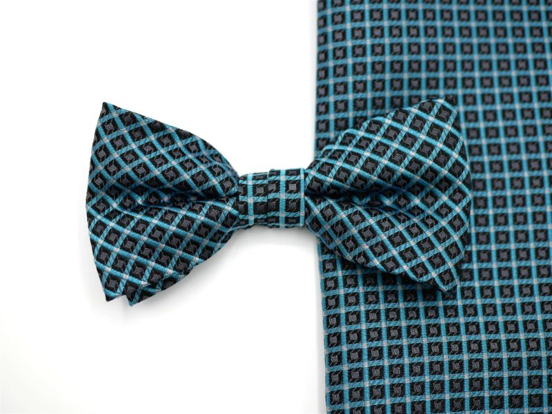 Diese 6 cm breite Fliege wurde in petrol/blau gemustert aus reiner Seide mit Tuch designt