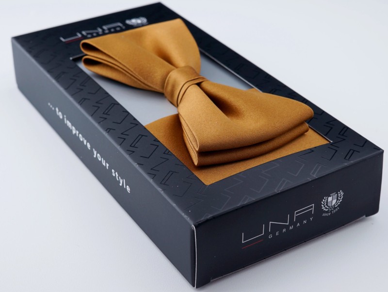 Diese 4 cm breite Fliege wurde in leicht glänzender Optik in cognac mit passendem Tuch designt