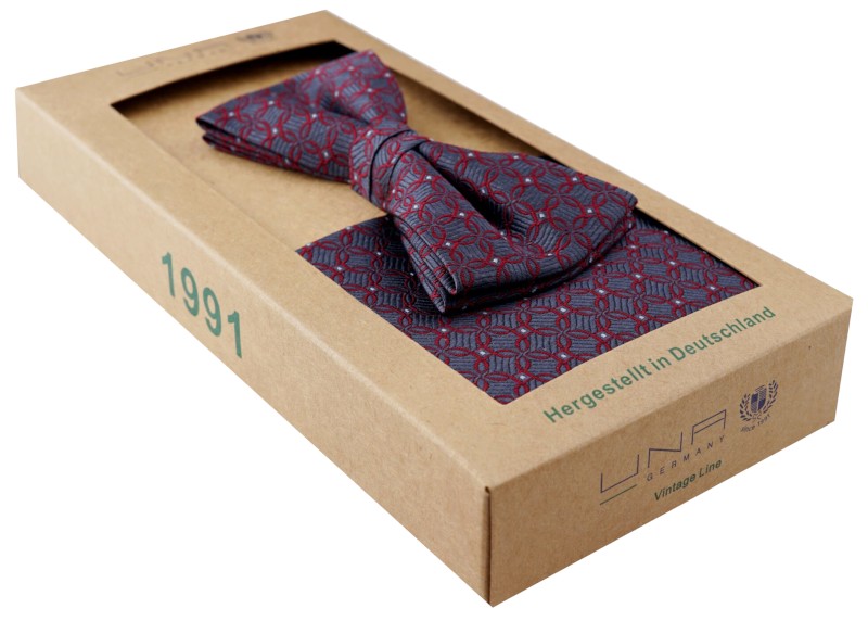 Diese 4 cm breite Fliege aus reiner Seide wurde in leicht glänzender Optik in bordeaux/anthra gemustert mit passendem Tuch designt