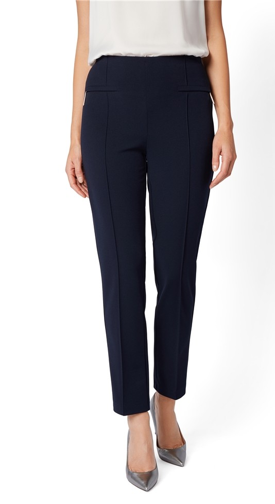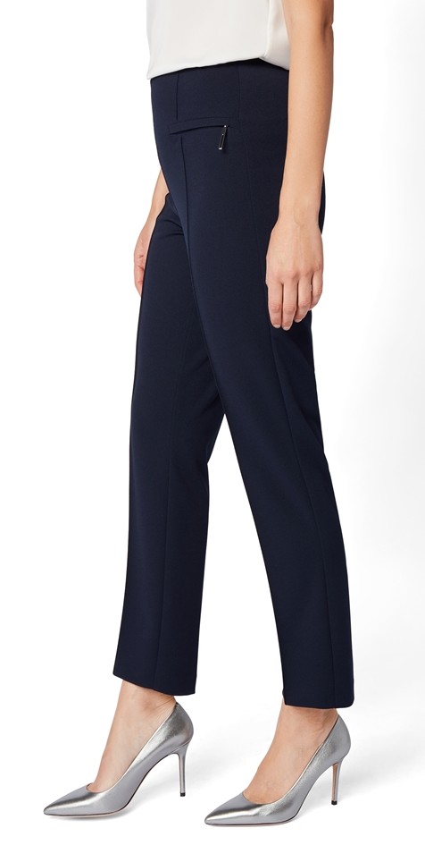 Diese schmal geschnittene Hose in dunkel blau mit Gummibund sowie zwei Ziertaschen vorne hat auch durch den Anteil von Elasthan eine ideale Passform und kann selbst zu den besonderen Anlässen getragen werden