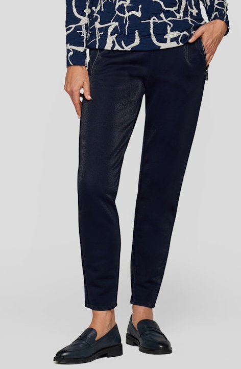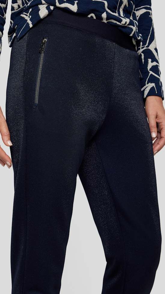 Diese etwas schmalere sowie bequeme Hose mit elastischem Bund vereint Stil und Komfort in marine Blau. Die dekorativen Reißverschlüsse sowie die dezent glänzende samtige Optik machen die Hose zum echten Allrounder für alle Anlässe