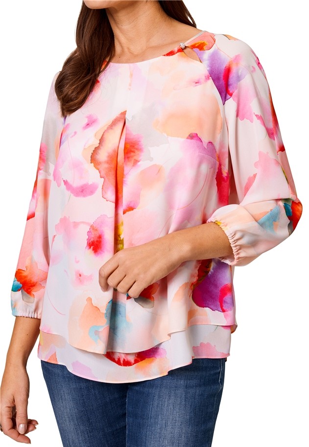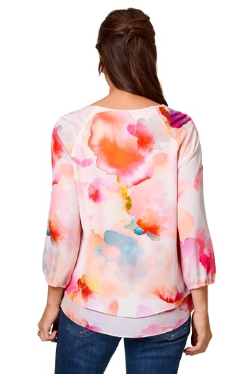 Dieses edle Shirt wurde in beig-pink floral gemustert designt. Mit geschmücktem runden Ausschnitt sowie 3/4 langem Arm und romantischer Faltenlegung vorne lässt sich diese Bluse mit leichtem Glanz auch zu den besonderen Anlässen prima kombinieren