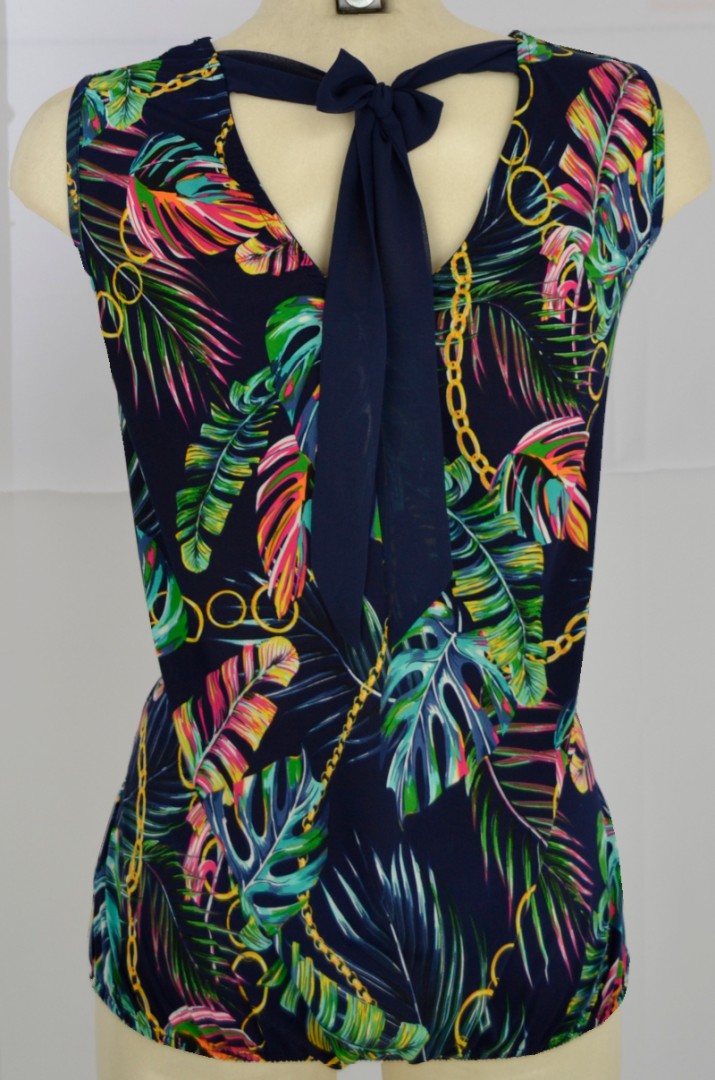 Ein romantisches Shirt ohne Arm mit rund-um-gummi im Abschluss das in mehrfarig dunkel blau floral gemustert designed wurde. Der V-Ausschnitt mit Bändchen hinten machen dieses Shirt zu etwas besonderem
