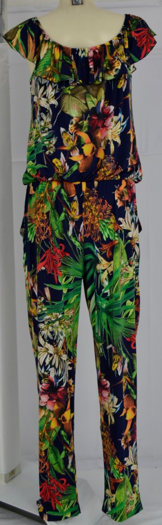 Dieser sommerliche Jumpsuit wurde im Jungle Dessin gefertigt. Das Oberteil mit rundem Ausschnitt im Blouson-Style und die Hose mit den zwei seitlichen Taschen machen diesen Jumpsuit zum echten Hingucker