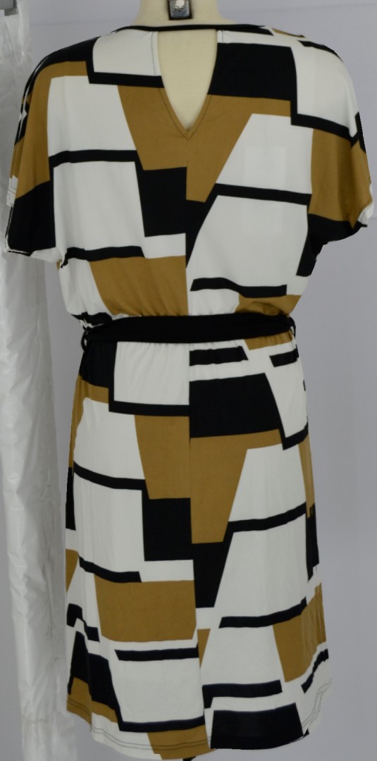 Das sommerliche mittellange Kleid wurde in schwarz-ecrue-camel designt. Der überschnittene Arm sowie der romantische runde Ausschnitt verleiht diesem Modell einen ganz besonderen Charme