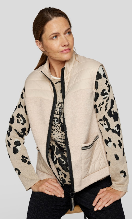 Entdecken Sie die perfekte Weste mit Komfort und Stil. Weiches Teddy-Fleece und gesteppte Einsätze sowie die Kontrastfarben machen dieses Modell mit R-V und zwei geräumigen Fronttaschen zum zeitlosen kuschligen Begleiter