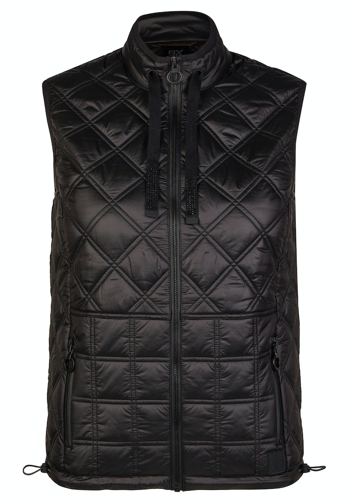 Diese modisch sportive Steppweste in uni schwarz mit Stehbund und R-V lässt sich immer einfach kombinieren. Der romantische Glanz verleiht diesem Modell einen zusätzlichen Charme