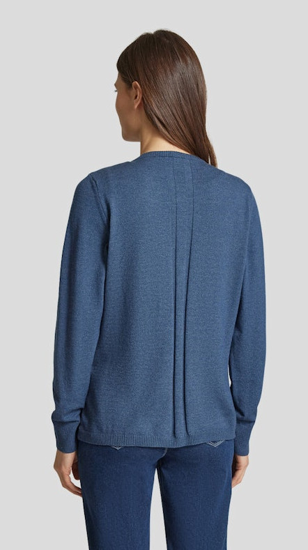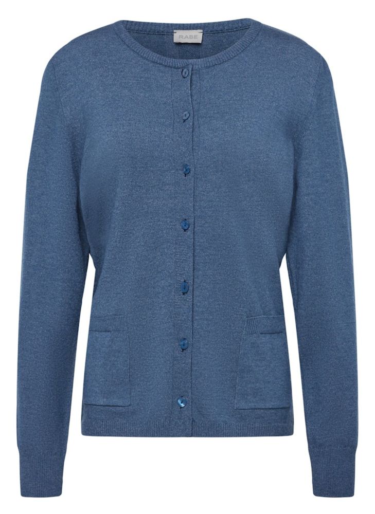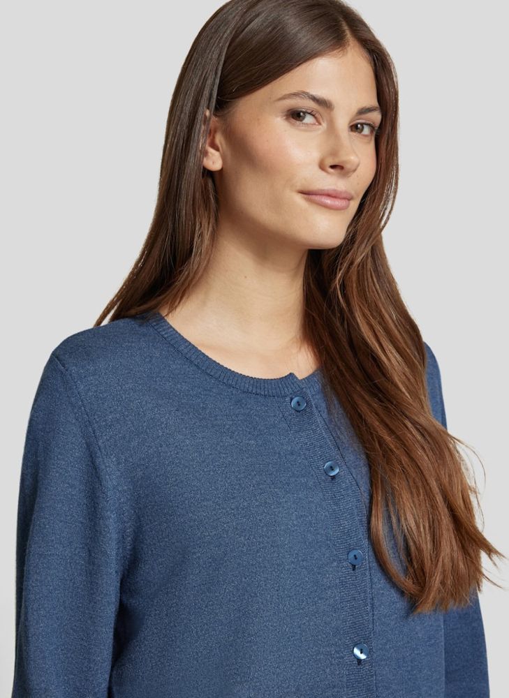 Diese hochwertige klassische Strickjacke wurde in uni Jeansblau meliert als durchgeknöpfte Variante und rundem Ausschnitt designt. Die zwei Fronttaschen und die Rückenfalte verleihen dieser Jacke einen zusätzlichen Charme