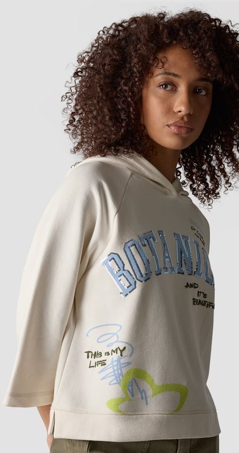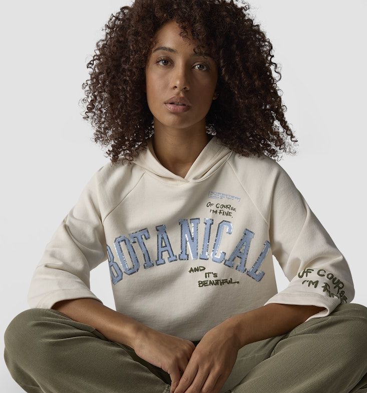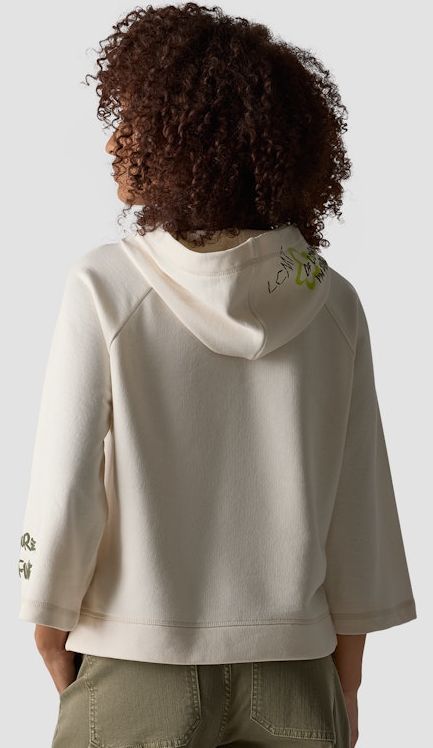 Sportiv - Feminin mit leicht verkürzter Länge wurde dieser Hoodie in Elfenbein designt. Mit V-Ausschnitt - Kapuze und weiterem 3/4 Arm ist dieses Modell mit romantischem Print ein Must-have