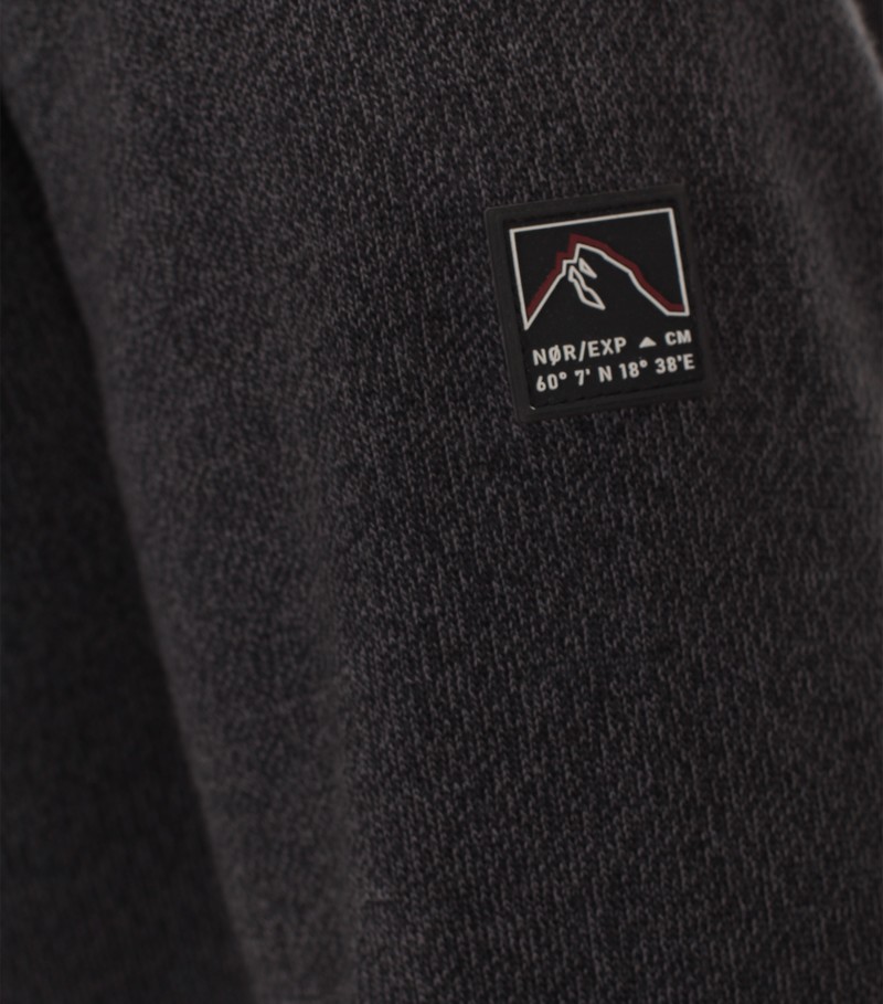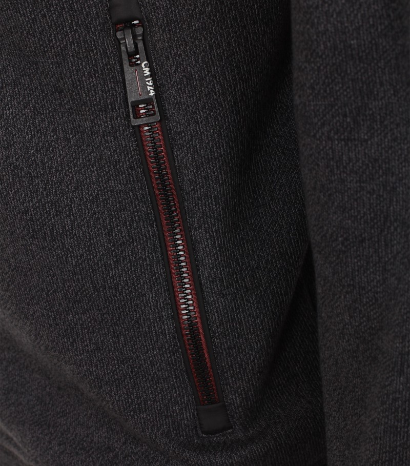 Diese sportive Sweatjacke in anthrazit-schwarz meliert wurde mit R-V und Kapuze sowie seitlichen Taschen designt