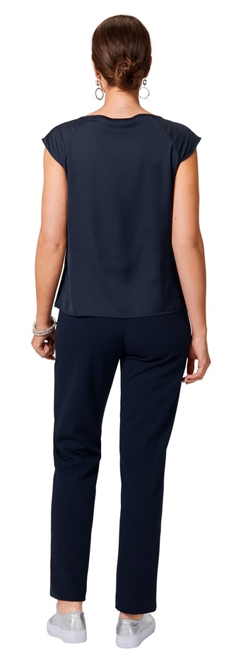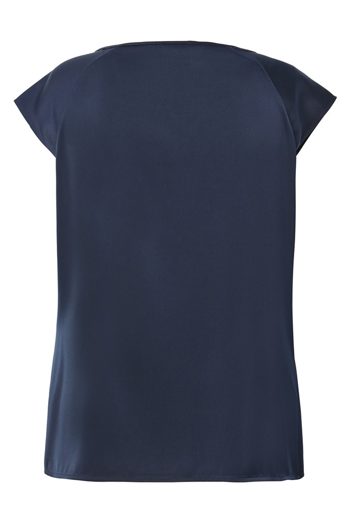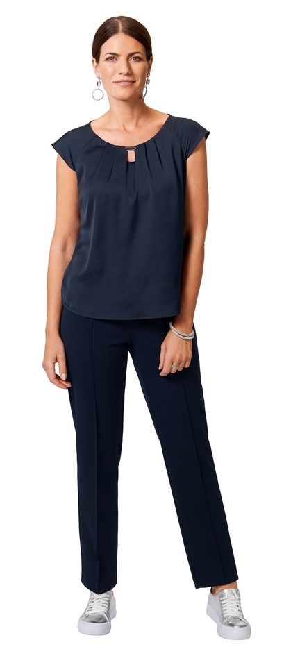 Dieses edle Top wurde in uni marine blau designt. Mit Schmuckstange sowie überschnittenem Arm und Raffung unter dem runden Ausschnitt lässt sich dieses Modell mit leichtem Glanz auch zu den besonderen Anlässen prima kombinieren