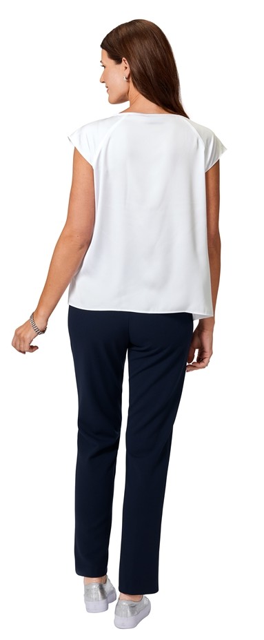Dieses edle Top wurde in uni weiß designt. Mit Schmuckstange sowie überschnittenem Arm und Raffung unter dem runden Ausschnitt lässt sich dieses Modell mit leichtem Glanz auch zu den besonderen Anlässen prima kombinieren