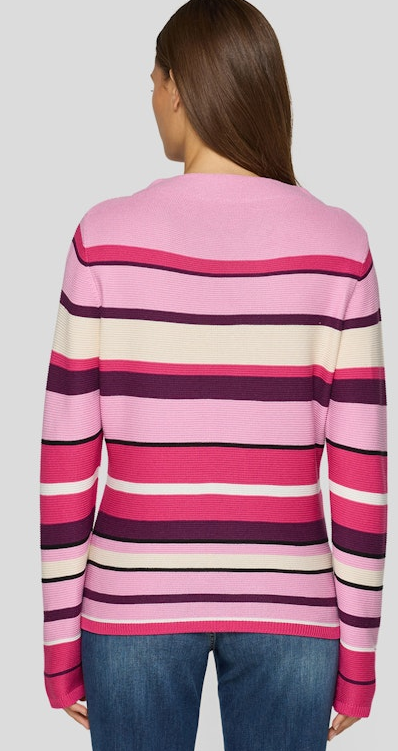 Dieser Feinstrick Pullover mit modernem Streifendessin sowie kleinem Stehkragen verleiht eine dezente Eleganz und ist ideal zum kombinieren. Auch die weiche Materialmix spricht hier für sich