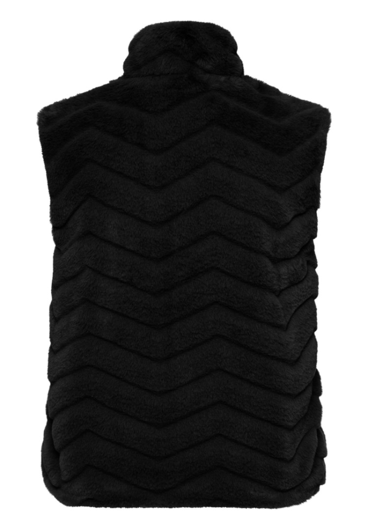 Die sportiv - kuschelige Weste aus PES-Pelzimitat mit Stehkragen und Eingrifftaschen wurde in leicht verkürzter Länge in schwarz designt sorgt immer für ein weiches und gemütliches Tragegefühl