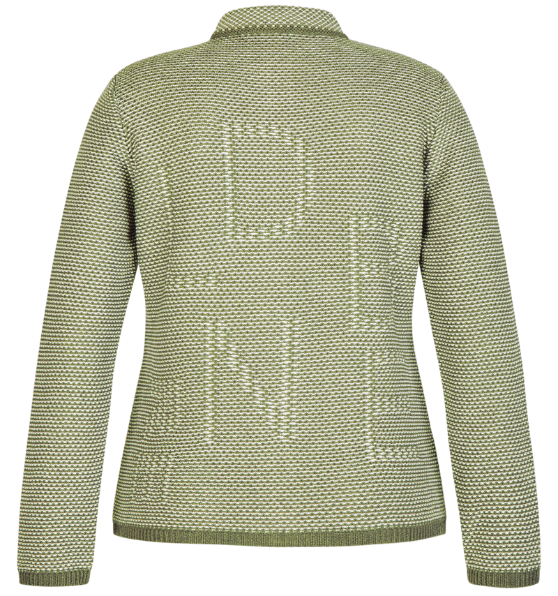 Die top aktuelle Strickjacke zum knöpfen wurde in lindgrün mit weiß gemustert designt. Hochgeschlossen sowie mit Bändchen am Kragen und 1/1 langem Arm ist diese Jacke ein echter Hingucker